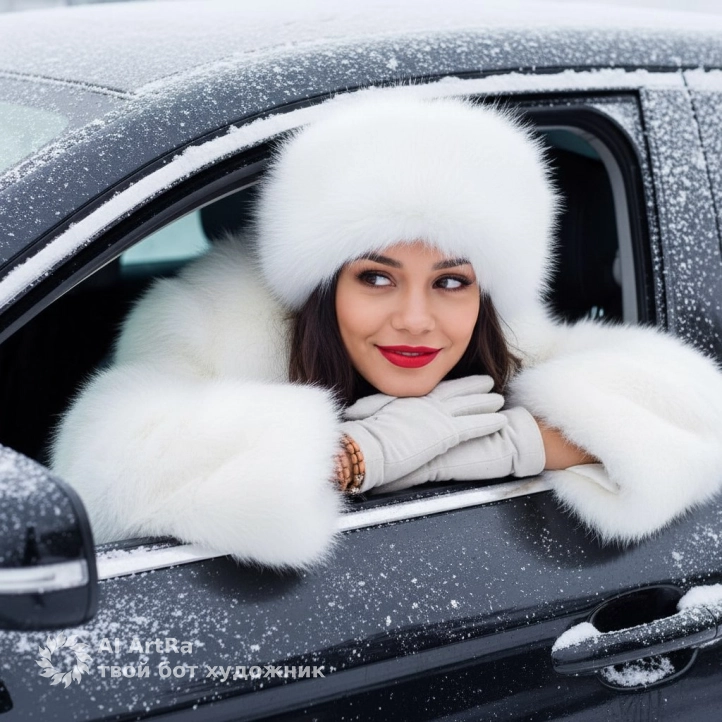 Зимний профессиональный бьюти‑портрет через окно автомобиля: чёрная машина иномарка, покрытая инеем и рыхлым снегом; в открытом окне, опершись на сложенные руки, женщина в роскошной белой меховой шапке и белой шубе. Чистая кожа, лицо без изменений, яркая красная помада; взгляд слегка в сторону, лёгкая улыбка. Контраст белого пушистого меха и чёрного кузова, снежная крошка на кромке стекла, мягкий рассеянный дневной свет, холодная зимняя палитра с тёплым тоном кожи. Неглубокая ГРИП, акцент на лице, editorial/fashion, ощущение зимнего люкса, кадр по плечи, уровень глаз;,мягкий контраст, лёгкая матовая кинематографичная цветокоррекция.