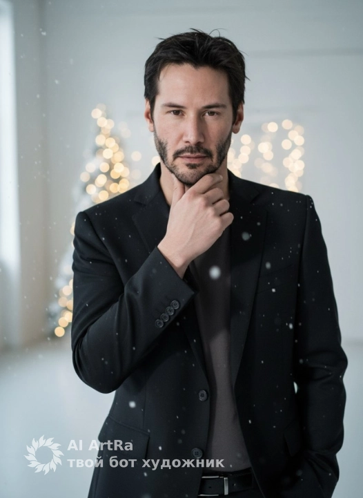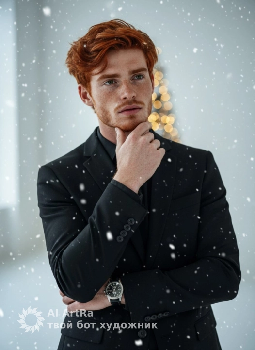 Base image: a young man in his late 20s wearing a black tailored suit, posing confidently with one hand touching his chin against a dark studio background. Transform this portrait into a winter editorial-style photo while keeping his facial features, hairstyle, pose, and clothing intact. Change the environment to a softly lit indoor winter setting — a minimalist white studio with warm golden Christmas lights and subtle falling snow in the background. Add soft ambient light from the left side to create a premium magazine look with gentle contrast and realistic shadows. Maintain his black outfit and accessories but balance color tones with cool midtones and warm highlights for cinematic depth. Preserve the original framing, depth of field, and composition. Ensure seamless integration of snow and lighting without any artifacts or cutout traces. Output one ultra-realistic image with a high-end editorial photography feel, premium magazine aesthetic, ultra-realistic skin texture, and DSLR-quality depth of field (85mm lens look), matching the Base image’s resolution and aspect ratio.