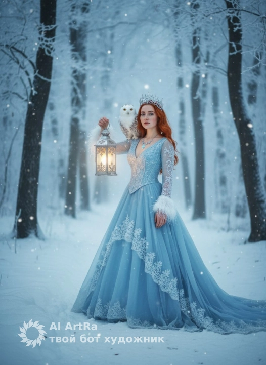 Winter forest, snow-covered ground, frosted trees with dark trunks. Soft ambient light. Woman in icy blue gown: fitted bodice, deep V neckline, cinched waist, layered floor-length skirt with train. Sheer sleeves with frost-like lace and feathery cuffs. stands sideways, looking into the camera. Crystal necklace with glowing pendant. Silver crown shaped like icicles and snowflakes. One snowy owl on her right shoulder: white feathers with black/brown markings, yellow eyes. Makeup: pale blue eyeshadow, soft pink glossy lips. She holds ornate lantern with snowflake patterns, warm glow illuminating her face and snow. holds the flashlight at face level. foggy forest, twilight, small snowflakes visible in the air.