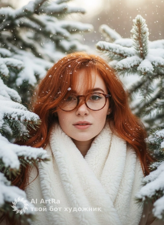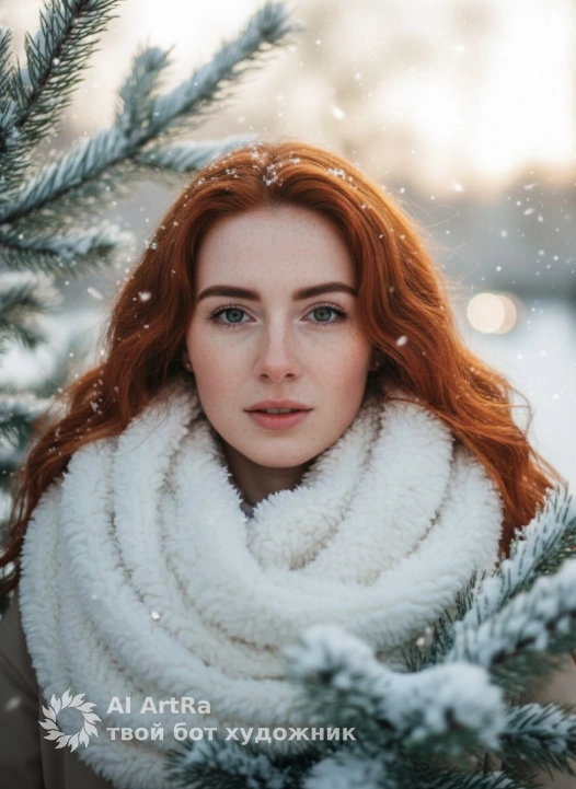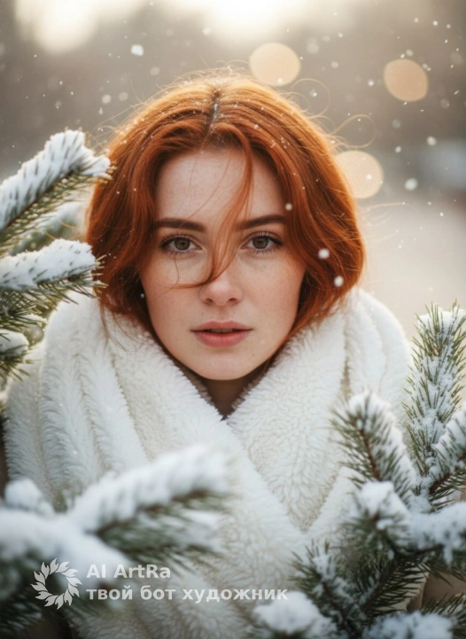 Close-up of a woman's face looking directly at the camera, framed by snow-covered branches of an evergreen pine tree and scattered snowflakes falling around her face, her hair is slightly tousled and falling into her face, she wears a thick, textured white faux fur scarf covering her shoulders, natural makeup with emphasis on her eyes, very shallow depth of field, creamy bokeh in the background, soft and diffused daylight from above, backlighting and subtle rim light on her hair and fur, snowflakes on branches, scarf, hair. Photorealistic, high detail, sharp focus on the eyes, shot with 85mm portrait lens, 8K resolution.