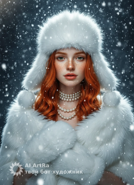 Use the user's appearance 1:1 — face without any changes. A glamorous portrait of a woman in a dramatic winter setting, captured from a medium, slightly low-angle perspective. She is wearing a large, fluffy white faux fur ushanka hat with ear flaps down and small pom-poms. Adorning her neck are multiple opulent strands of lustrous white pearls, layered as chokers and longer necklaces. She is enveloped in a luxurious, shaggy white faux fur wrap, with her hands elegantly placed in matching white faux fur mittens. Her wavy hair flows out from under the hat. The atmosphere is enchanting and cold, with a heavy fall of bright white snowflakes creating a magical, ethereal effect. The lighting is dramatic and directional, coming from the top-left, casting bright highlights on the white fur, pearls, hair, and face, creating depth and a sophisticated glow. The background is dark and out of focus, enhancing the focus on the subject and the falling snow.