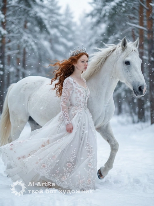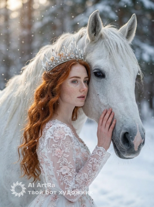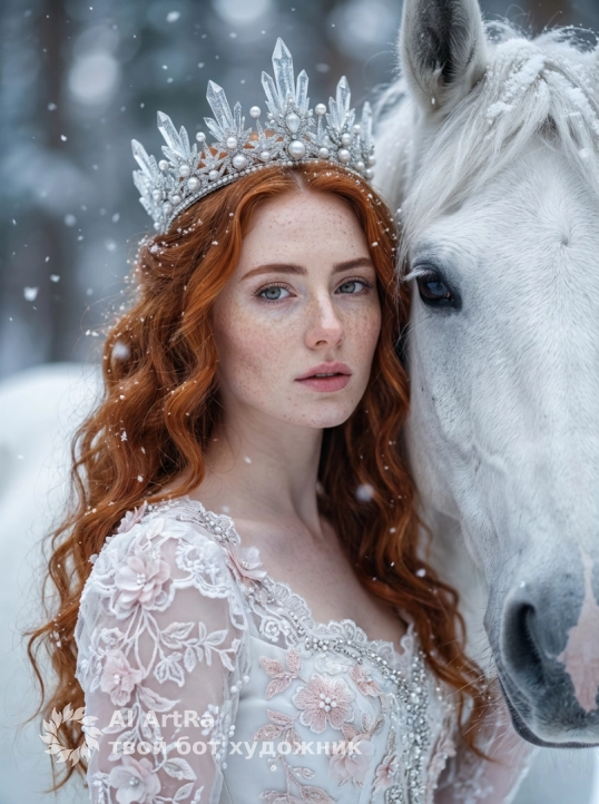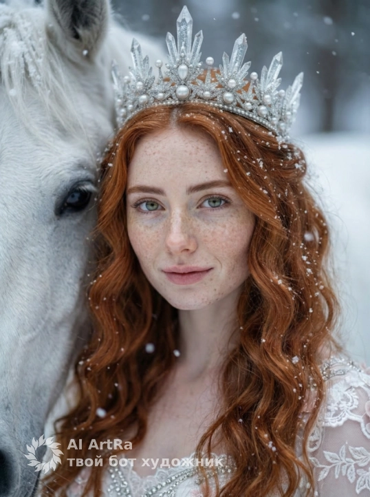 Создай крупный макро портрет, не меняя черты лица. Крупный план (close-up) прекрасной молодой женщины в образе Зимней Королевы, стоящей рядом с величественной белой лошадью. На женщине роскошная серебряная корона, инкрустированная кристаллами льда и жемчугом, и нежно-розовое платье с богатой вышивкой и объемными цветами. У неё вьющиеся волосы . Вокруг кружатся мягкие снежинки. Атмосфера волшебная, холодные тона, мягкое естественное освещение, высокая детализация кожи и текстур ткани, гиперреализм, Одежда белая в стиле рококо с кружевом и бисером. Эффект падающего снега, боке, мягкий фокус, кинематографичное освещение, пастельные оттенки, 8k, детализация лиц и меха.