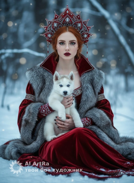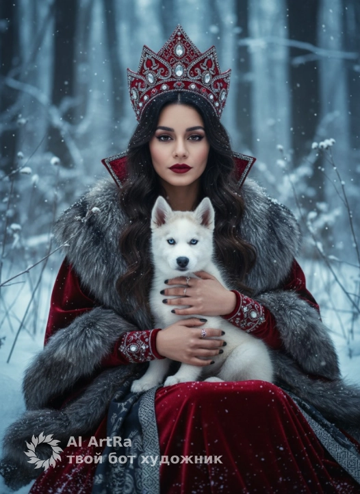 Используйте внешний вид пользователя, референса 1:1 — лицо, кожу, волосы и тело без каких-либо изменений. На лице — драматичный макияж с глубоким красным оттенком губ, акцентированными бровями и тонкими; ногти покрыты темным лаком, аккуратно оформлены, с едва заметным блеском; на пальцах — тонкие кольца с камнями, а на запястьях — браслеты из красной ткани с вышивкой и стразами; главный объект — женщина в величественном наряде, сидящая в снегу и держащая на руках белого щенка хаски, который смотрит прямо в камеру; стиль — высокодетализированная цифровая живопись с элементами фэнтези и исторической реконструкции, напоминающая кинематографичный портрет; фон — зимний лес с заснеженными сухими стеблями и голыми ветвями, размытый боке, создающий глубину и атмосферу уединения; освещение мягкое, рассеянное, с холодным синеватым оттенком, подчеркивающим контраст между теплыми тонами одежды и ледяной природой; камера на уровне глаз, композиция симметричная, с центральным размещением фигуры, ракурс фронтальный, слегка снизу, что придает героине величественность; масштаб кадра — средний план, охватывающий фигуру от колен до макушки, с акцентом на детали костюма и взаимодействие с животным; атмосфера — мистическая, сказочная, с нотками древнего ритуала и тихой власти; одежда — роскошное платье из бархата и ткани с серебряными нитями, с объемными рукавами, отделанными серым мехом, и широким воротником; на голове — массивная, богато украшенная корона-венец из красных и серебряных элементов, с вышивкой, стразами и геометрическими узорами; поза — сидя на земле, ноги сложены, спина прямая, руки бережно поддерживают щенка, взгляд прямой, сосредоточенный, полный внутренней силы.