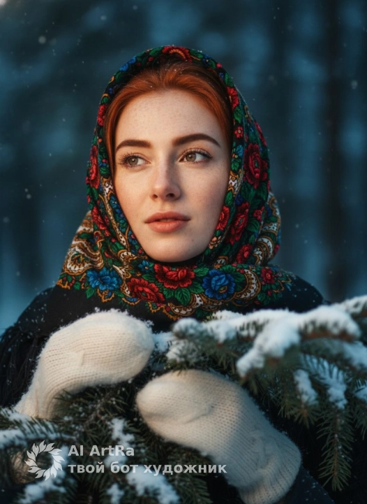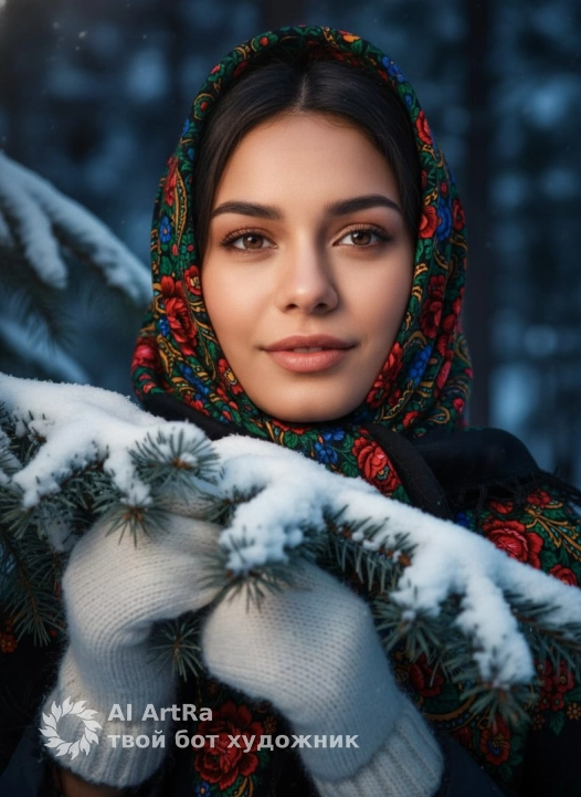 Не меняй черты лица A vibrant, close-up artistic portrait of a beautiful young woman with a serene expression, looking upwards or to the side. She is wearing a traditional Russian patterned headscarf (Pavlovo Posad style) with vivid red, green, and blue floral motifs on a dark background, tied neatly under her chin. She is also wearing white knitted mittens and is peeking out from behind a heavily snow-covered spruce branch. The background is a deeply blurred (bokeh effect) dark blue-green winter forest, creating a strong contrast. Dramatic, warm-toned spotlighting on her face and the front of the scarf, making her stand out against the dark, cool background. Shallow depth of field. Photorealistic, high detail. Artistic portrait photography. Calm and serene mood. Негативный Промт: (Low quality, worst quality, deformed, blurry, ugly, disfigured, poor lighting, out of focus, cropped, cartoon, painting, illustration, unsharp, bad composition, watermark)