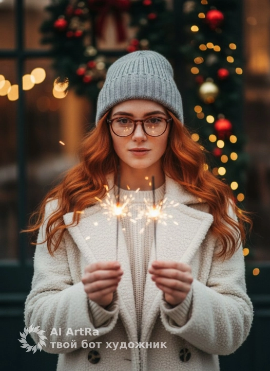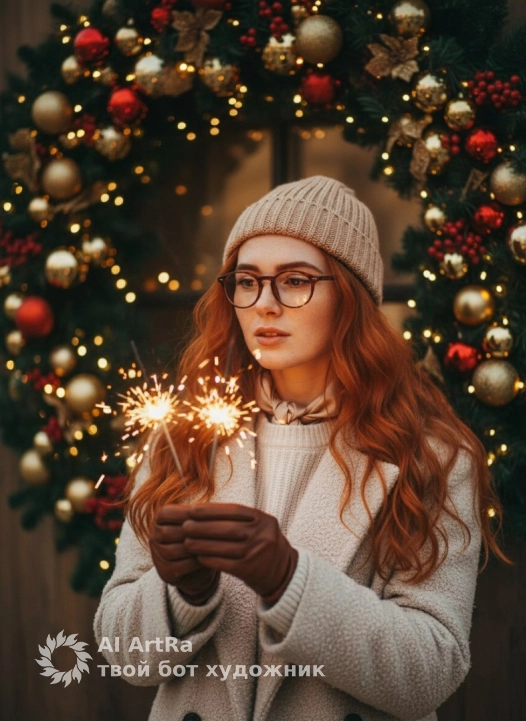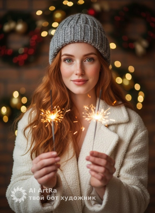natural winter holiday portrait, soft warm lighting, subtle festive bokeh in the background, realistic skin texture, natural colors, gentle shadows, clean true-to-life tones, high-quality DSLR photography look (50mm or 85mm lens), cozy winter outfit with textured wool coat, simple knitted hat, warm atmosphere, hands holding sparklers with soft natural glow, no plastic skin, no smoothing filters, authentic expression, minimal retouching, background decorated with Christmas wreaths, gold and red ornaments, warm fairy lights, soft film-like color grading, realistic depth of field, high-detail textures: hair, coat, hands, professional editorial style, style raw.