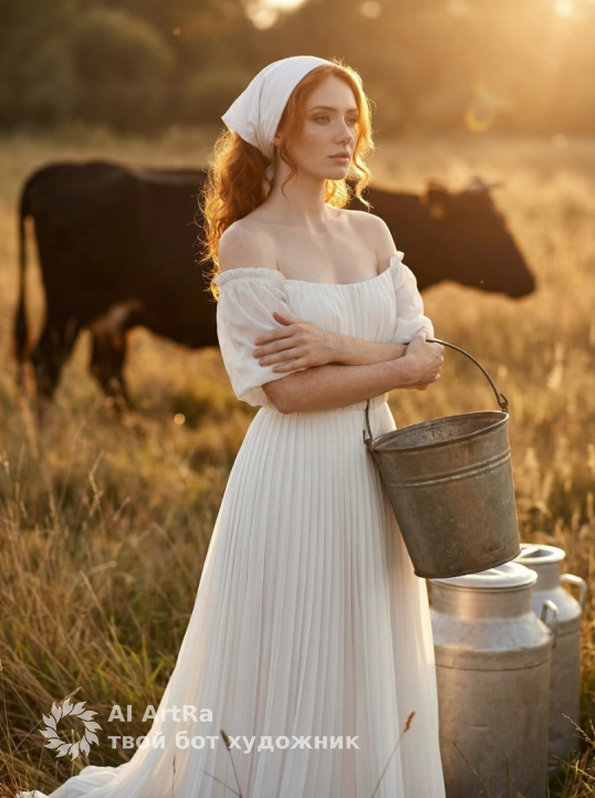 Используйте внешний вид пользователя, референса 1:1 — лицо, кожу, волосы и тело без каких-либо изменений. Девушка в длинном белом платье с открытыми плечами и пышной юбкой, украшенной складками, стоит в высокой сухой траве на закате, держа в руках старинное металлическое ведро, рядом с ней — два больших молочных бидона, а за спиной — темная корова, слегка размытая; на голове — белая тканевая повязка, напоминающая фермерский платок; макияж естественный, с акцентом на мягкий румянец и светлые тени; ногти короткие, без лака; украшений нет; стиль — реалистичная фотография с теплой золотистой цветовой гаммой, мягким боке и солнечными бликами, создающими мечтательную, ностальгическую атмосферу; ракурс — средний план, камера на уровне пояса, слегка снизу, композиция с акцентом на фигуру и ведро, фон — размытое поле и деревья на горизонте; освещение — золотой час, с боковым светом, подчеркивающим текстуру ткани и травы; поза — полуповорот к камере, взгляд в сторону, руки сложены на груди, одна держит ведро; масштаб — средний план, с акцентом на фигуру и предметы в кадре.