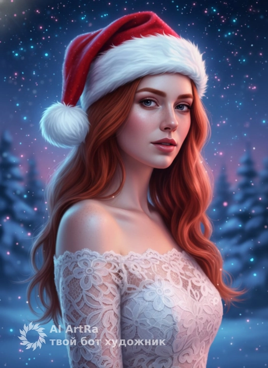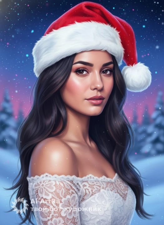 Используйте внешний вид пользователя, референса 1:1 — лицо, кожу, волосы и тело без каких-либо изменений. Женщина в красной шапке Санта-Клауса с пышным белым меховым ободом и объемным помпоном, одетая в кружевное платье с открытыми плечами и прозрачными ажурными деталями, смотрит на камеру в полоборота, с выражением тихой задумчивости. Стиль — гиперреалистичная цифровая живопись с неоновыми акцентами, где мягкие световые блики создают иллюзию мерцающих снежинок. Фон — ночное зимнее небо, усыпанное искрящимися розовыми и голубыми звездами, с едва различимыми силуэтами заснеженных деревьев в глубине, атмосфера наполнена сказочным сиянием и праздничной теплотой. Освещение контрастное: холодные синие тени сочетаются с теплыми розовыми отблесками на коже и кружеве, подчеркивая текстуру ткани и объем меха. Композиция — крупный план с акцентом на детали шапки и плеч, ракурс слегка снизу, усиливающий ощущение волшебства, а мелкие светящиеся частицы, парящие вокруг, добавляют динамики и глубины.