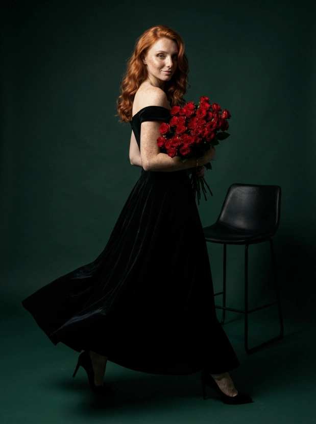 На арт фотосессии вы сможете запечатлеть уверенный и загадочный взгляд в окружении прекрасных красных роз. Сочетание черного бархатного платья в сочетании с минималистичными украшениями и вечерней укладкой создаст атмосферу утонченной элегантности.
