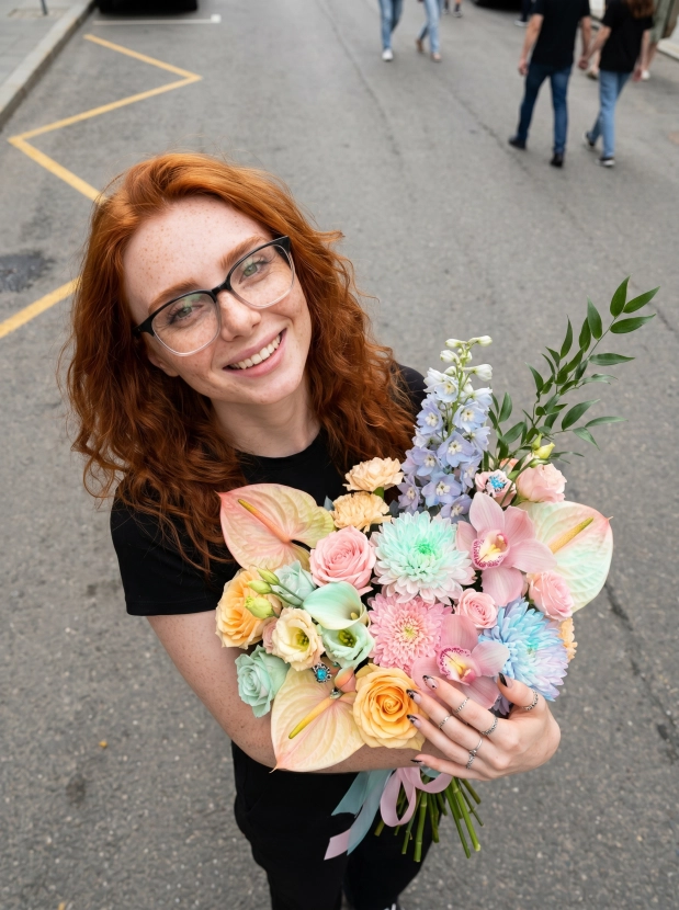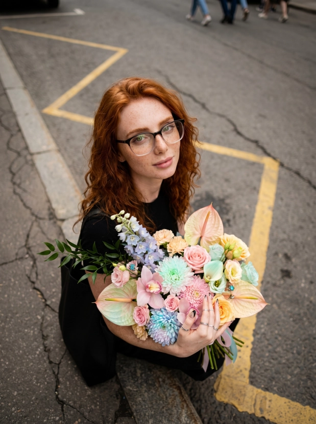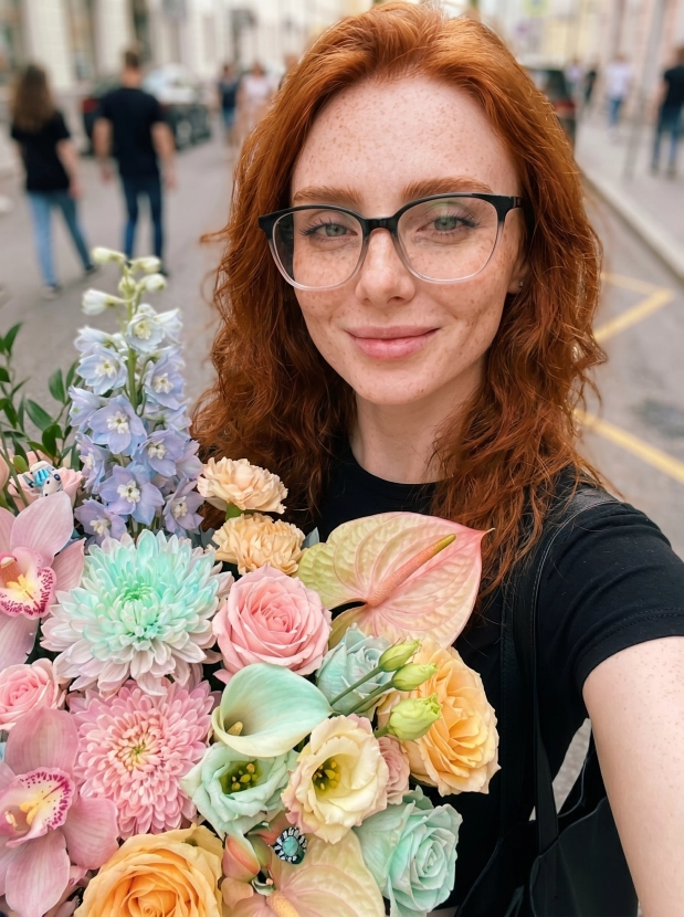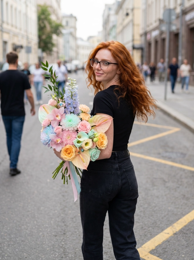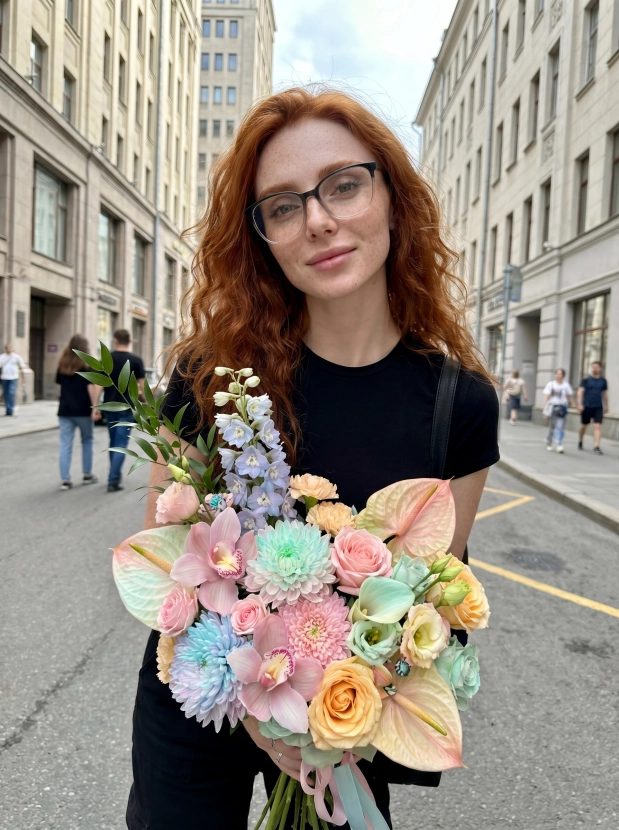 Вдохновляйтесь своей креативностью и создавайте уникальные фотосессии с помощью нашего сервиса ARTRA! Представьте себе эффектный кадр, где вы стоите в городской среде с большим букетом прекрасных цветов. Наша технологическая платформа позволяет вам воссоздать подобные образы, делая ваш контент в соцсетях еще более привлекательным и профессиональным.