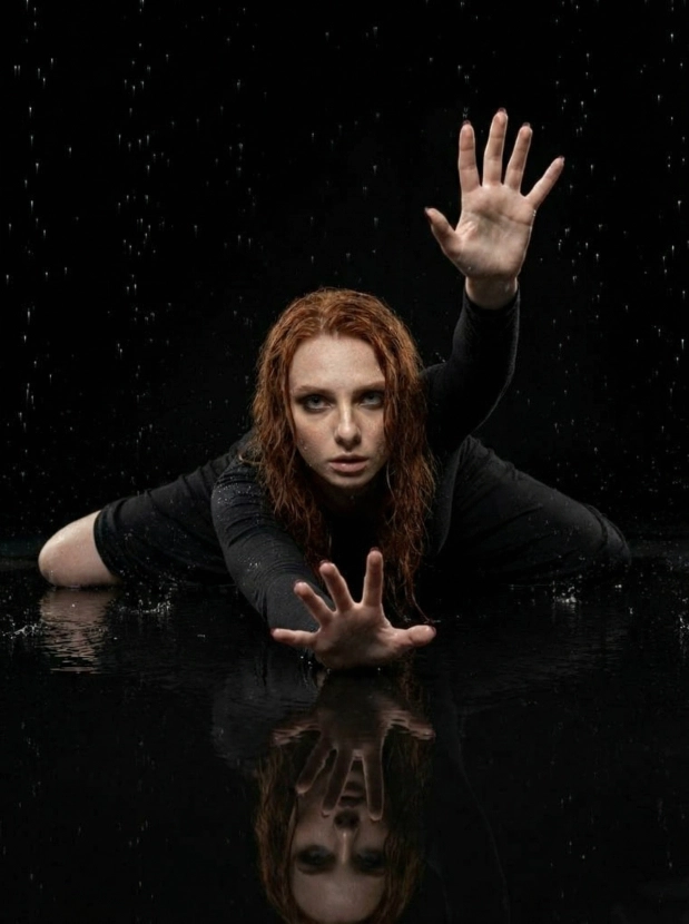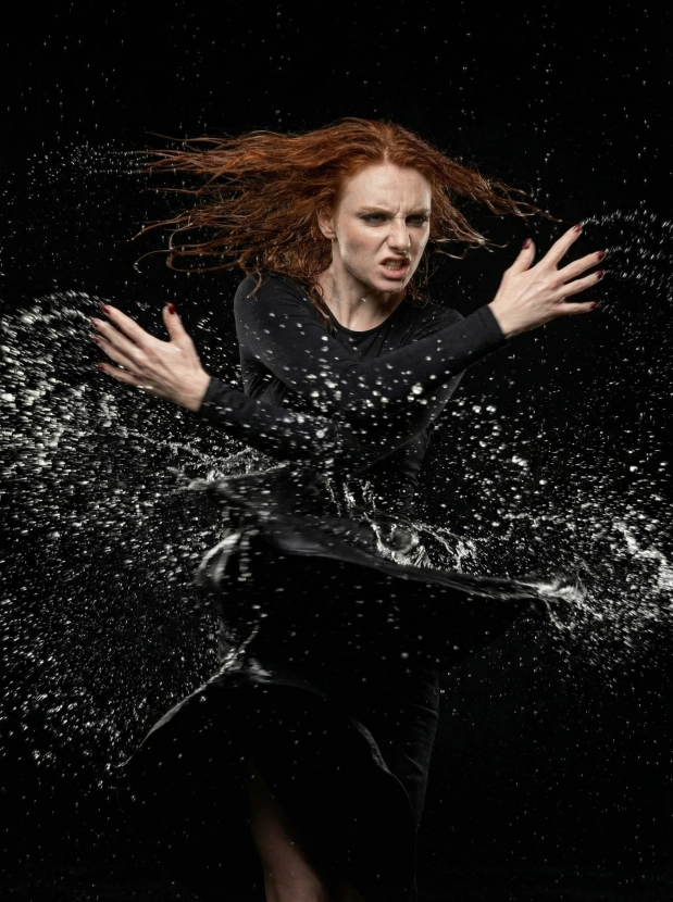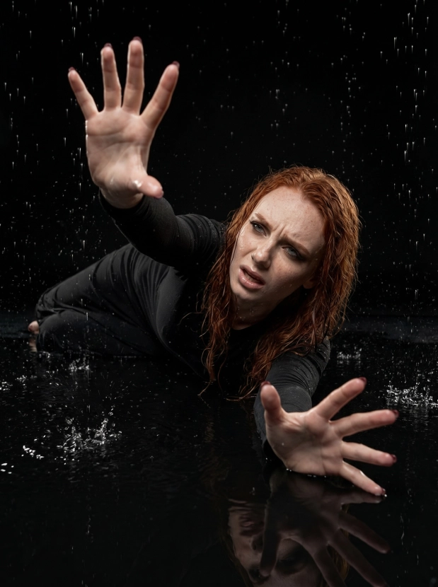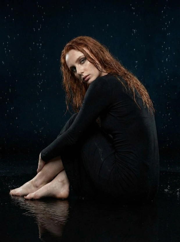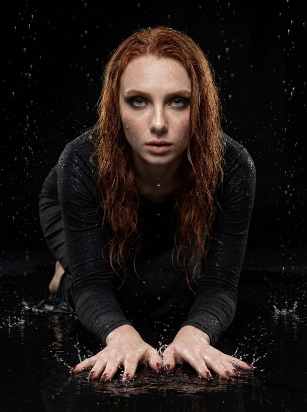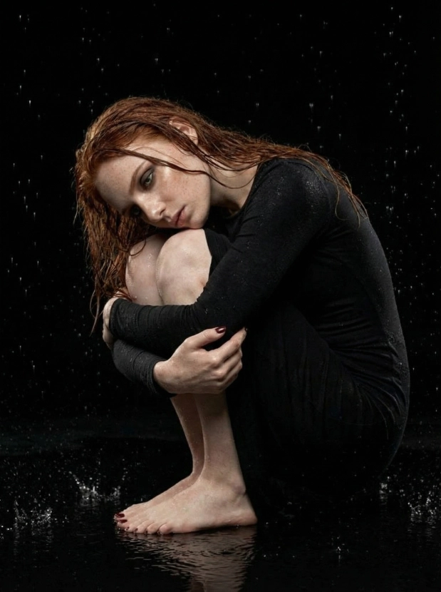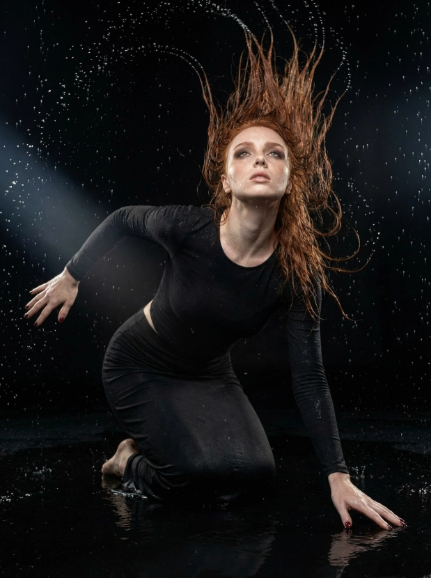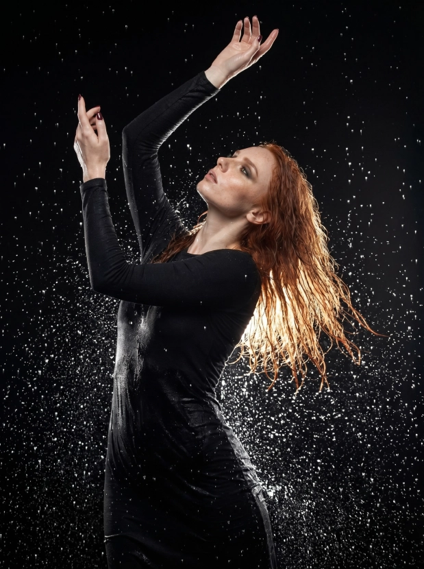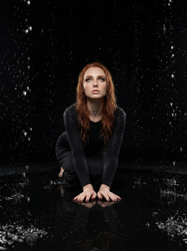 Драматичный портрет под дождём, женщина в чёрном платье в студии