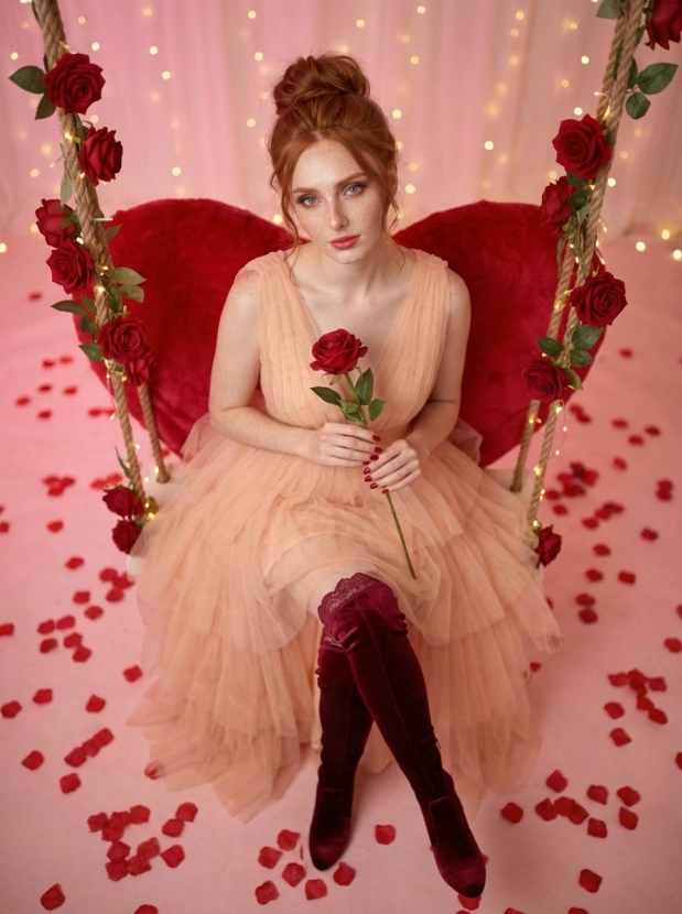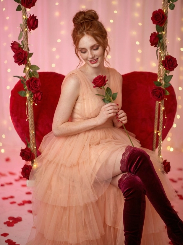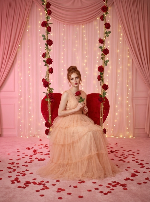 Представьте себя на подвесных качелях в форме сердца, окруженными нежными красными розами и мягким светом. Это не просто фотография, это настроение, которое наполнит ваши публикации чувствами и эмоциями. Благодаря профессиональной съемке и использованию Nano Banana PRO, вы получите наилучшее качество и стабильный результат.