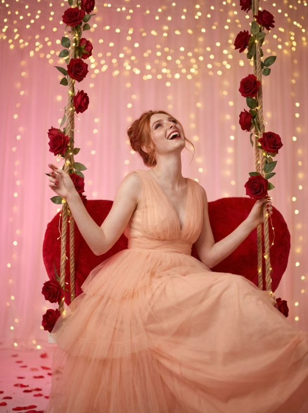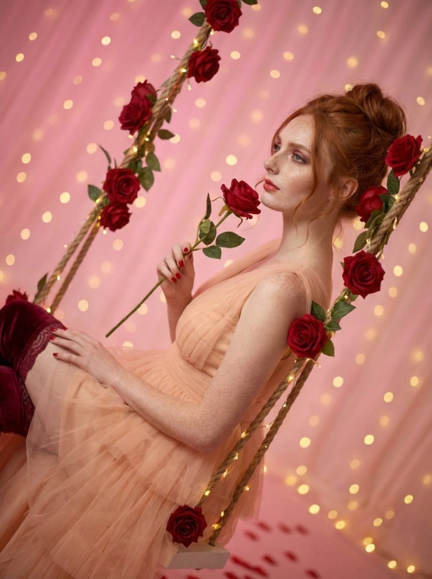 Фотосессия на качелях в форме сердца: романтичный образ с розами