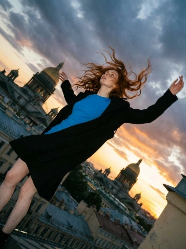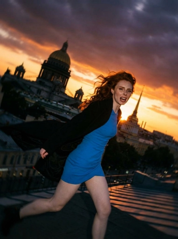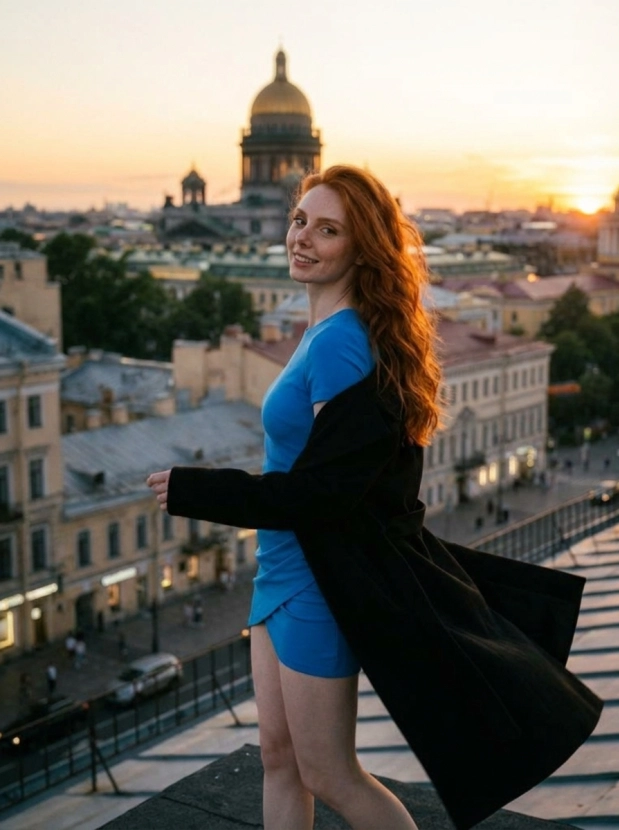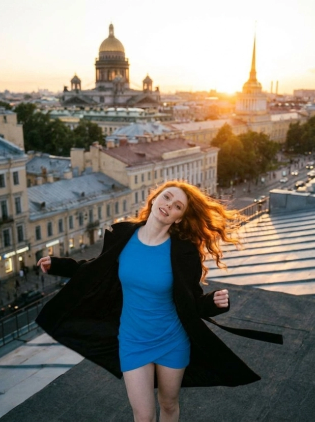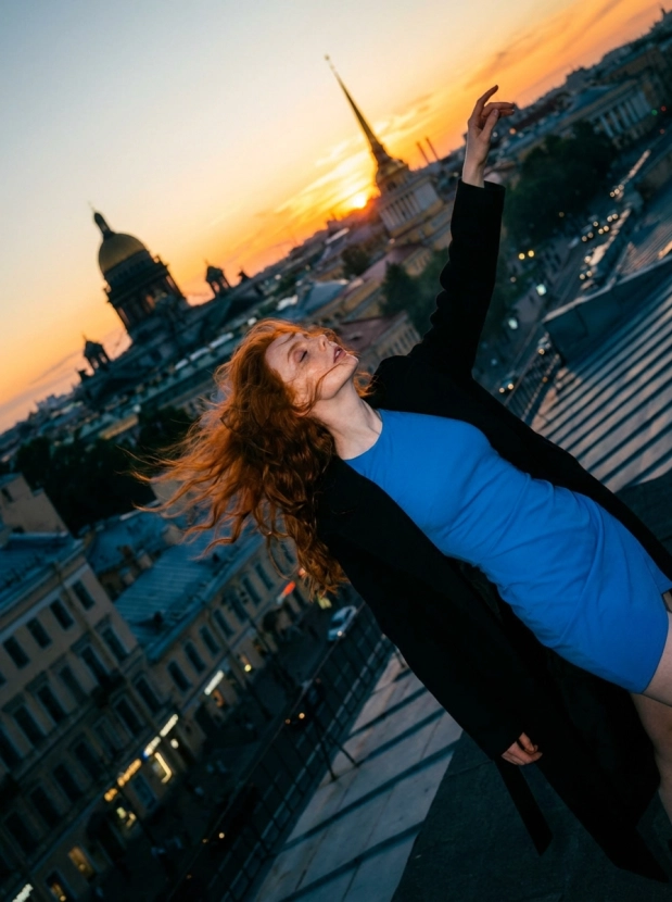 Вас когда-либо вдохновляла завораживающая ночь города, как в питерских фильмах? Теперь у вас есть возможность воплотить это в реалии с помощью нашей фотосессии на крыше! Восхитительное синее платье, контрастирующее с ночным небом, и чёрное пальто, развевающееся на ветру — все это создаст идеальный образ для ваших социальных сетей, личного бренда или даже профессионального портфолио.