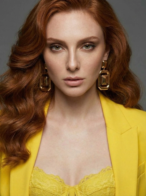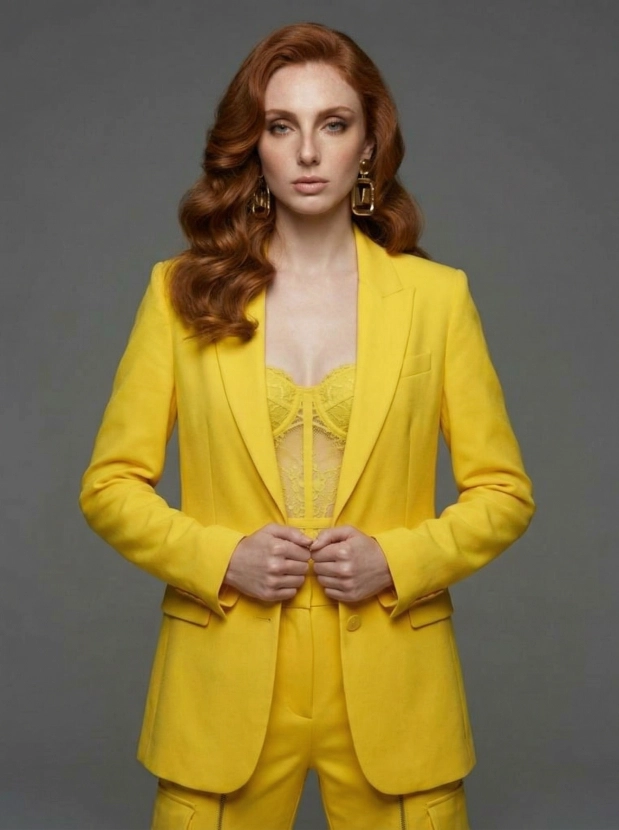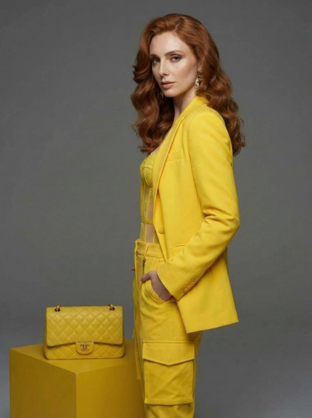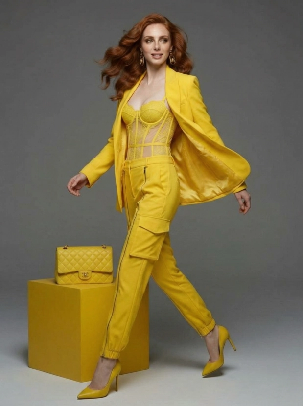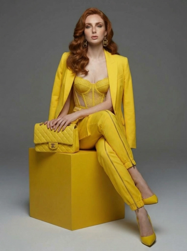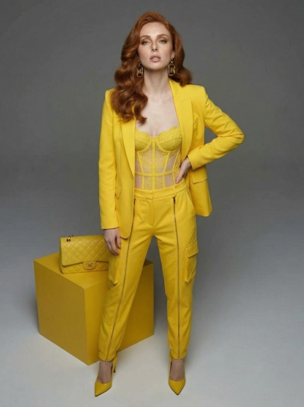 Монохромный шик, женщина в жёлтом образе высокой моды