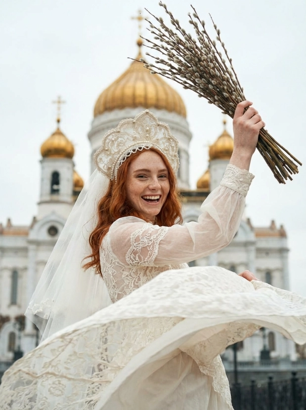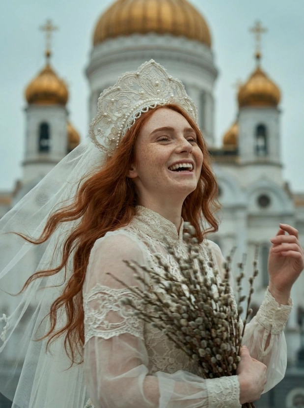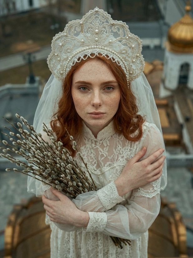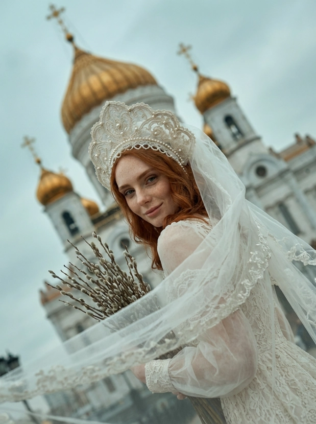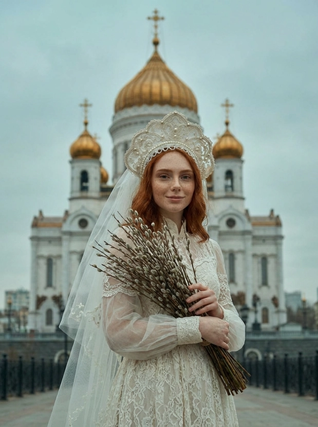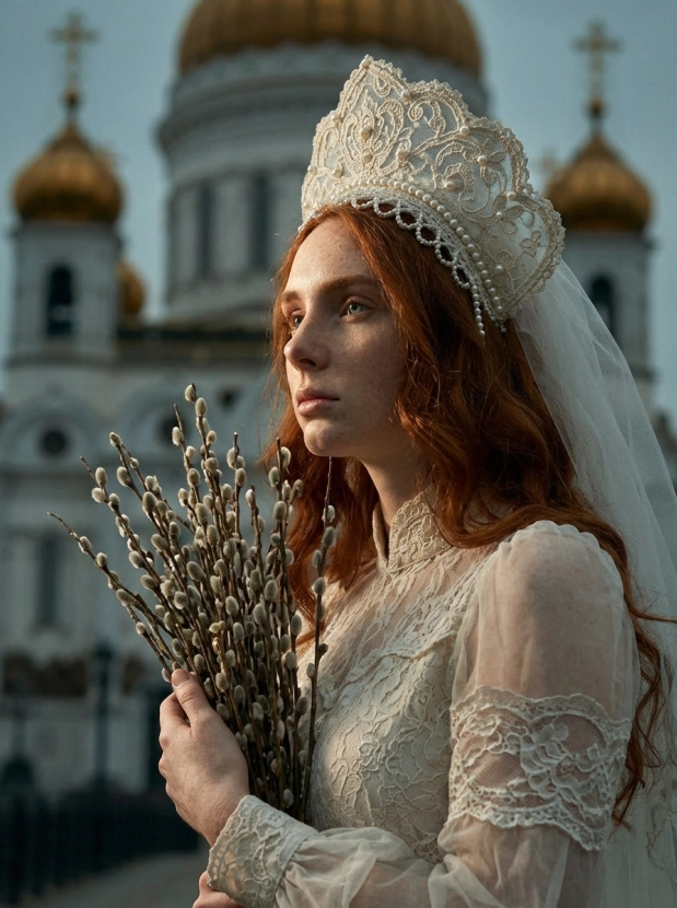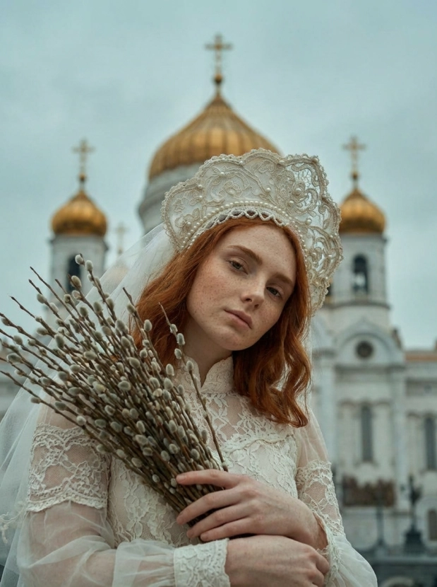 Портрет девушки у храма, вербное воскресенье