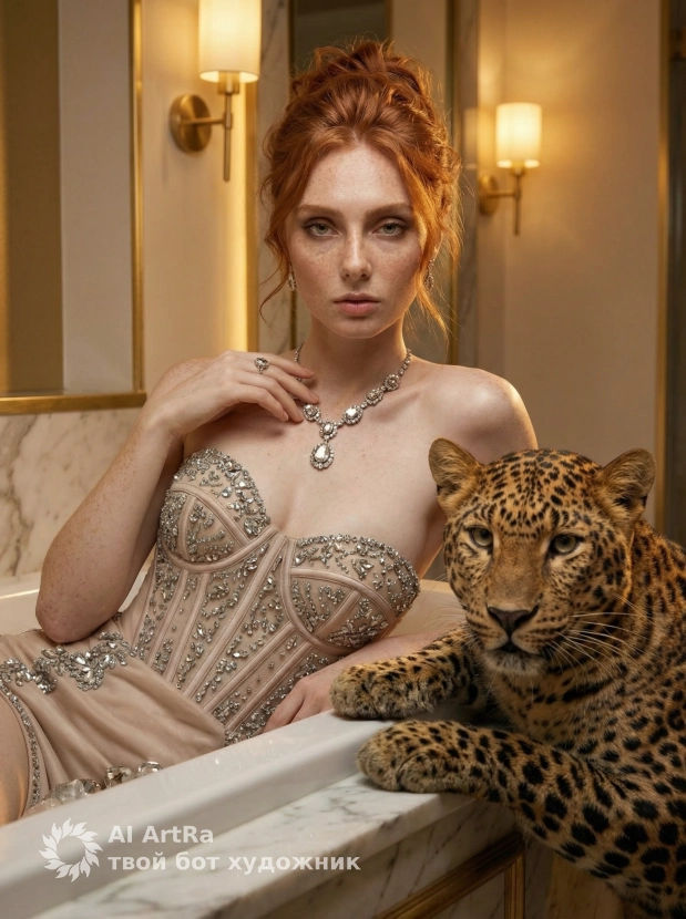 Представьте себе великолепный образ: изысканная женщина, отдыхающая в мраморной ванной, наполненной сверкающими кристаллами и драгоценными камнями, с реалистичным леопардом, исследующим эту атмосферу роскоши. Каждое из изображений будет ярким шедевром, который станет основой вашего личного бренда.