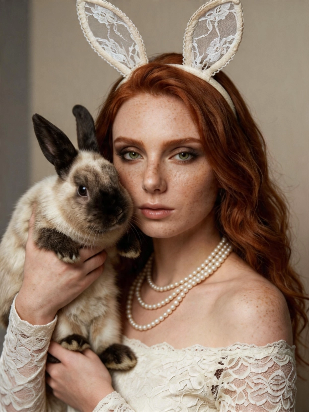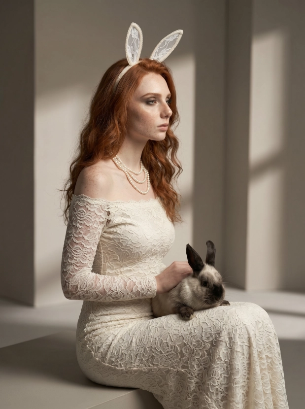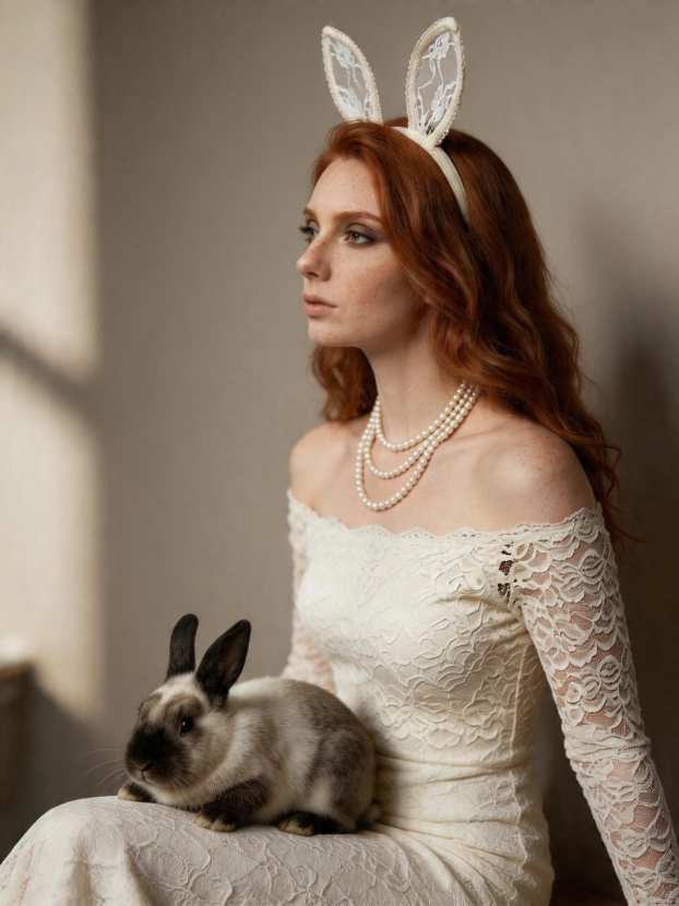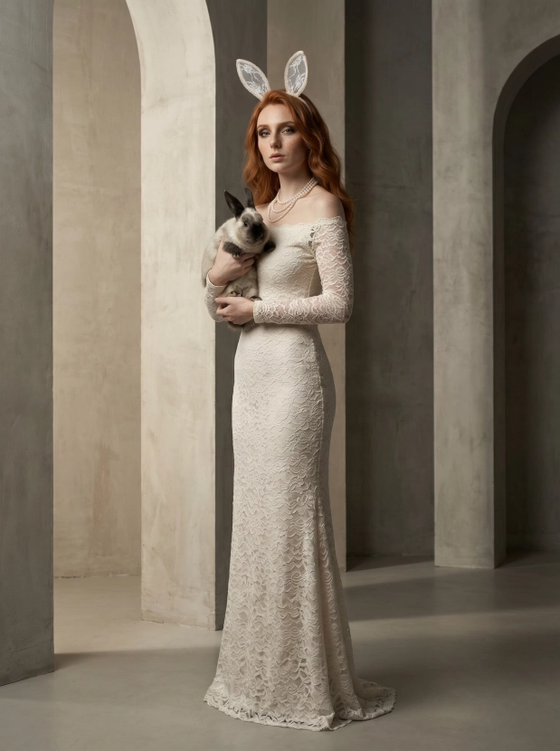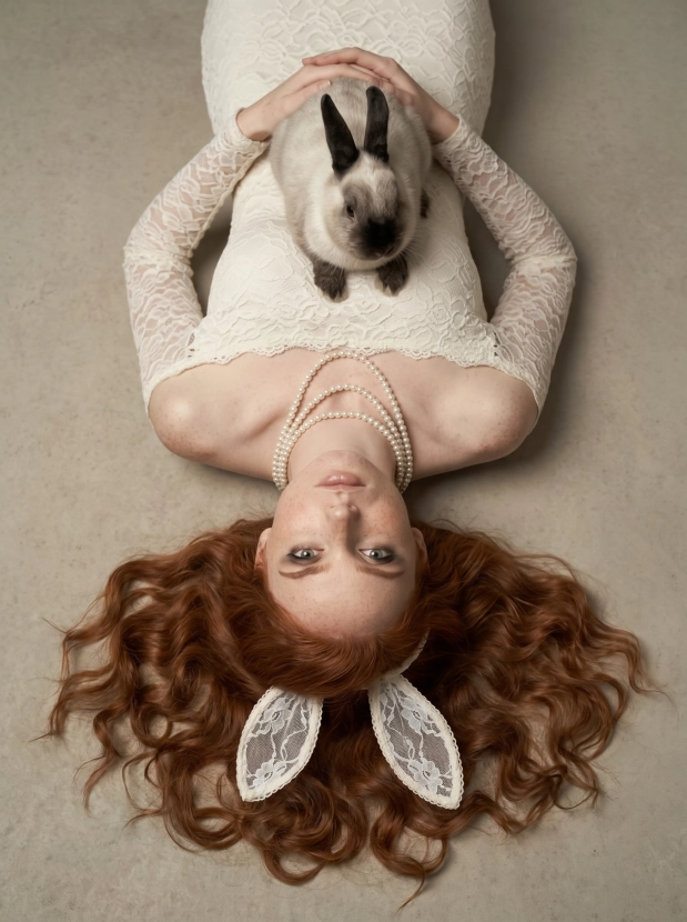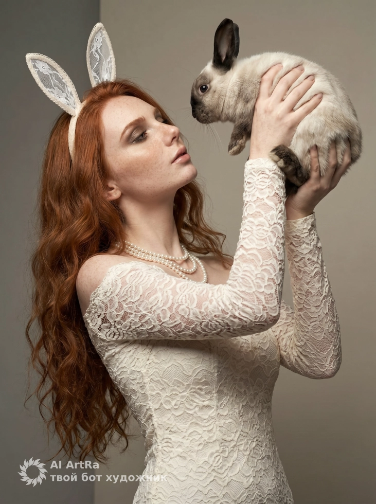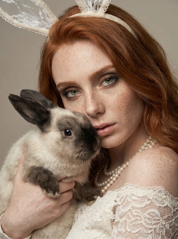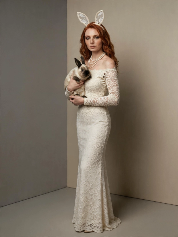 Портрет в кружевном платье с кроличьими ушами и кроликом