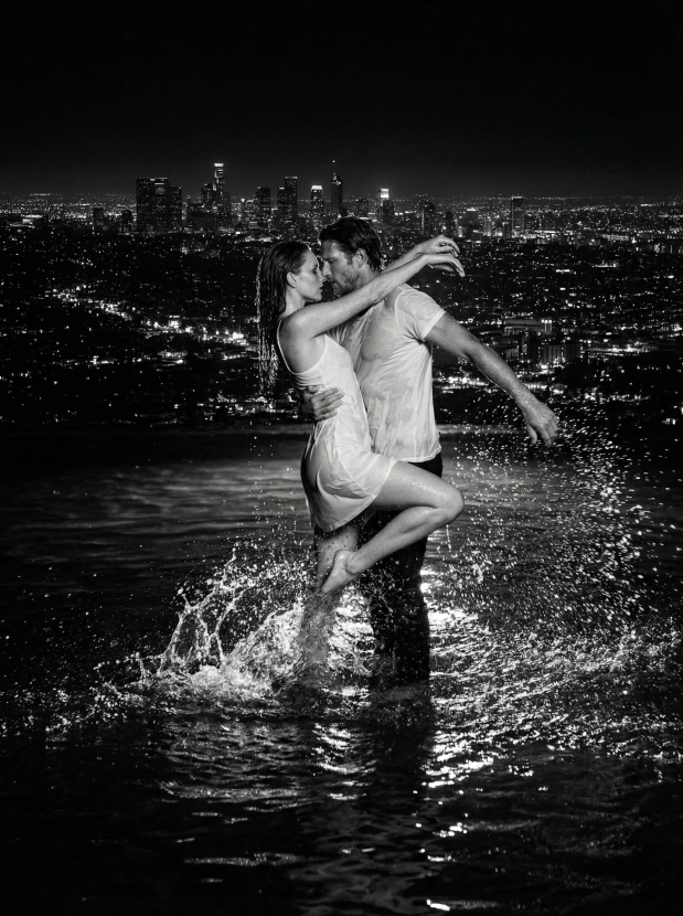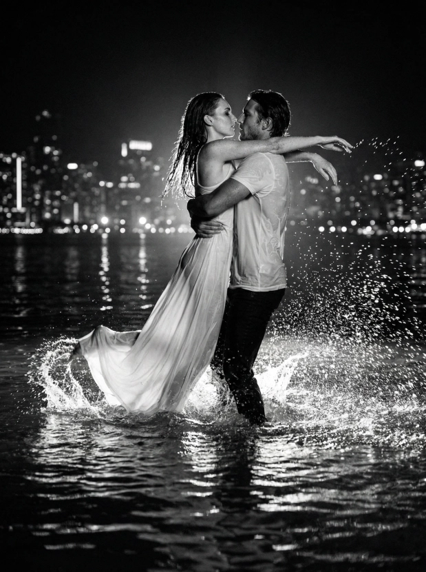 Романтический портрет пары в воде ночью