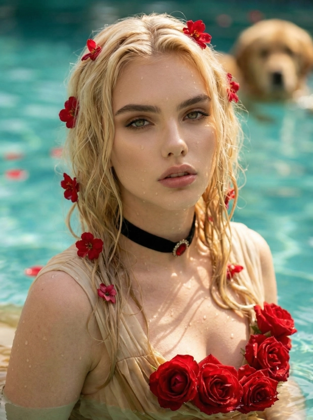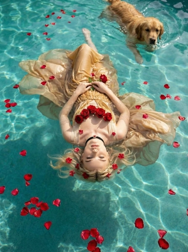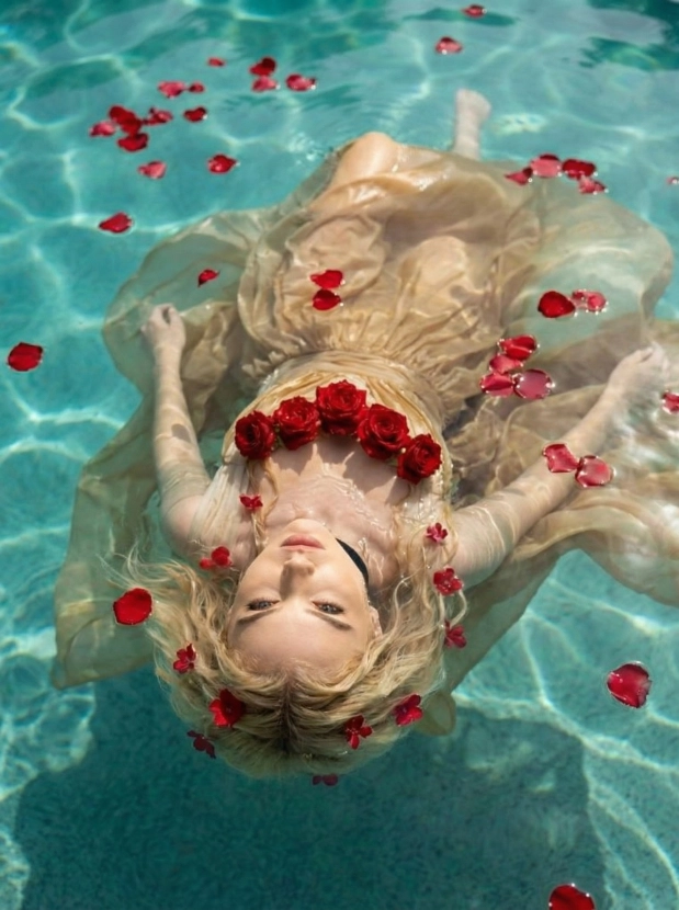 Романтика в воде, девушка с розами в бирюзовом бассейне