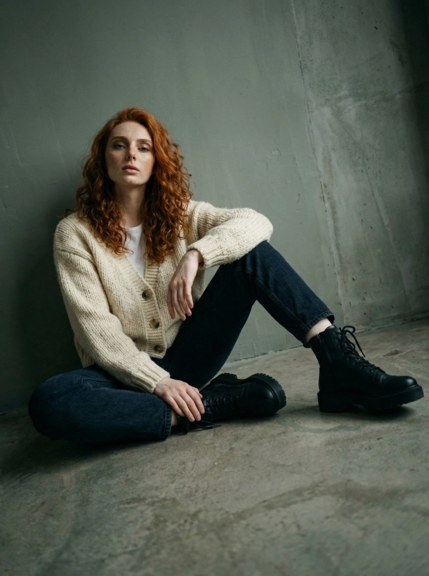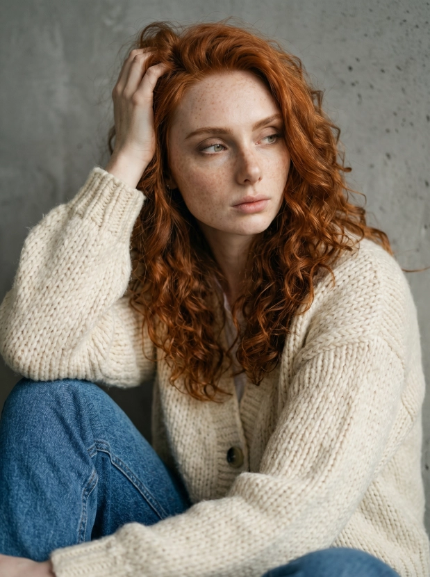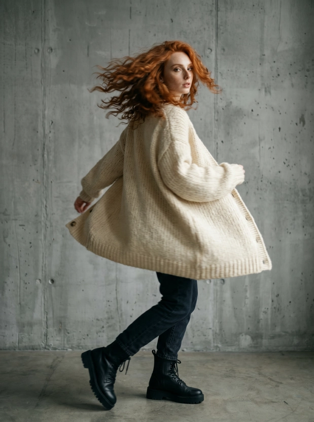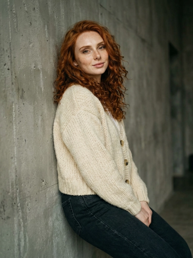 Этот стильный образ с вязаным кардиганом и этническим шармом на фоне серо-зеленой стены создаст атмосферу уюта и уверенности. Такой портрет отлично впишется в ваш имидж и наполнит ваш контент жизнью и эмоциональным откликом.