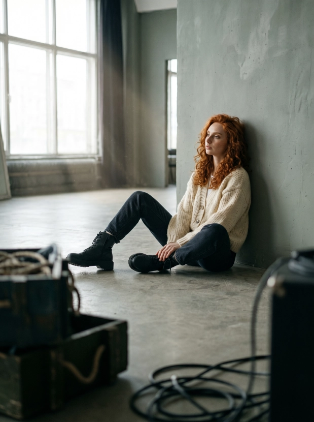 Спокойная эстетика, девушка в вязаном кардигане на полу