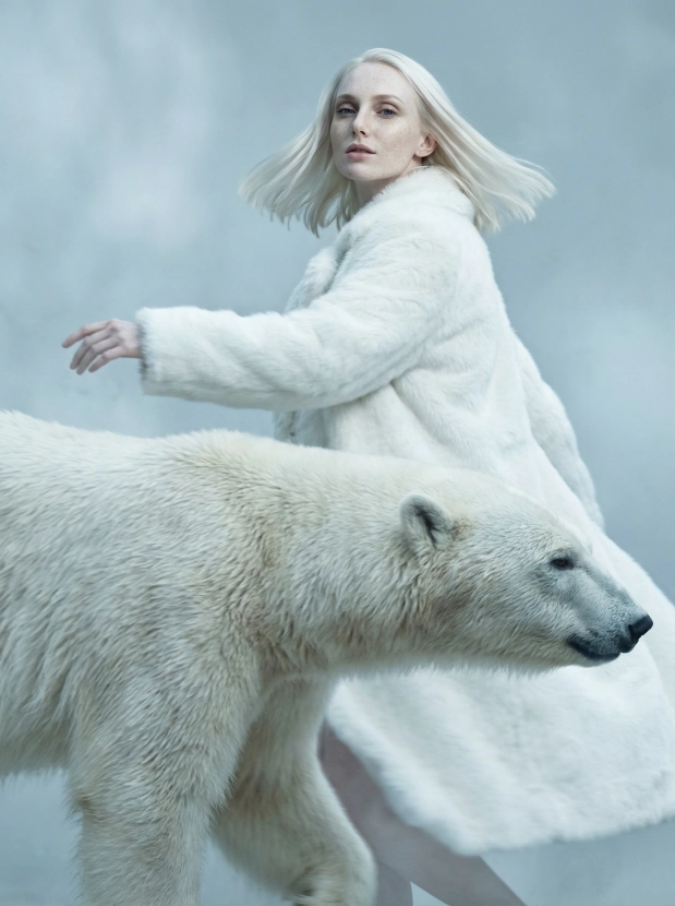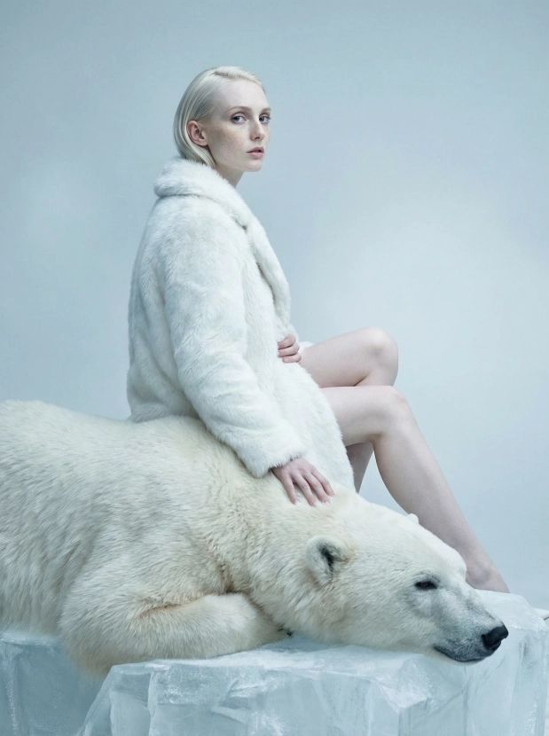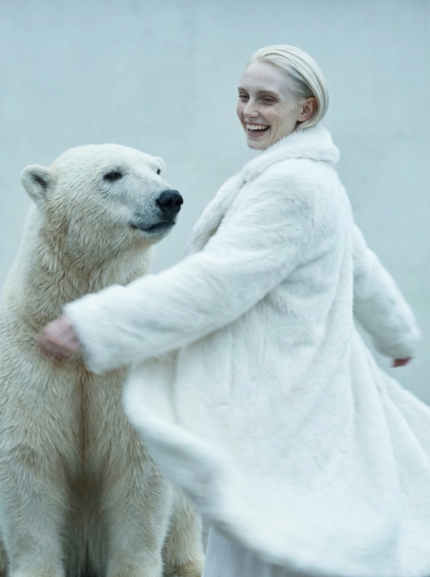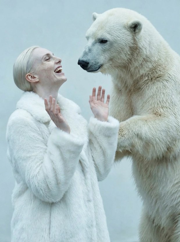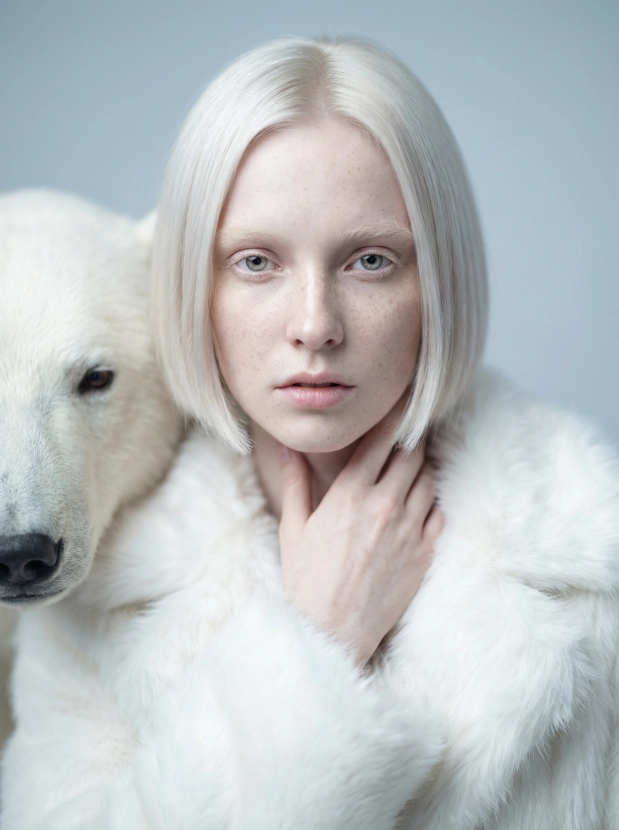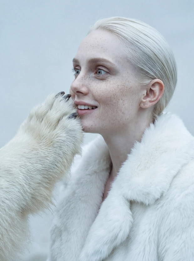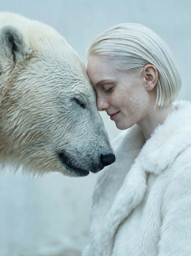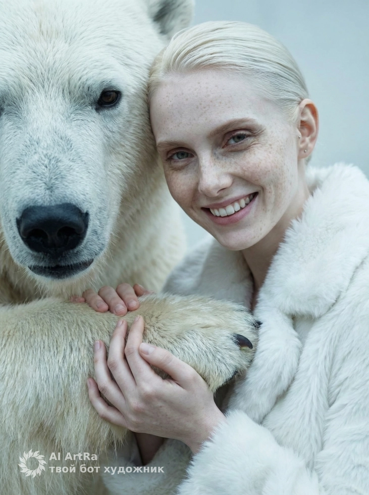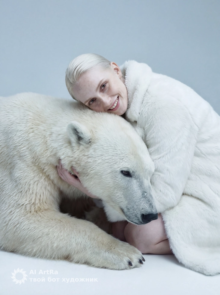 Представьте себе стильный образ: женщина с белым медведем на фоне, в который даже включены элементы высокой моды и искусства. Этот портрет может стать не только украшением вашего профиля, но и уникальным контентом для постов и обложек, что привлечет внимание ваших подписчиков и клиентов.